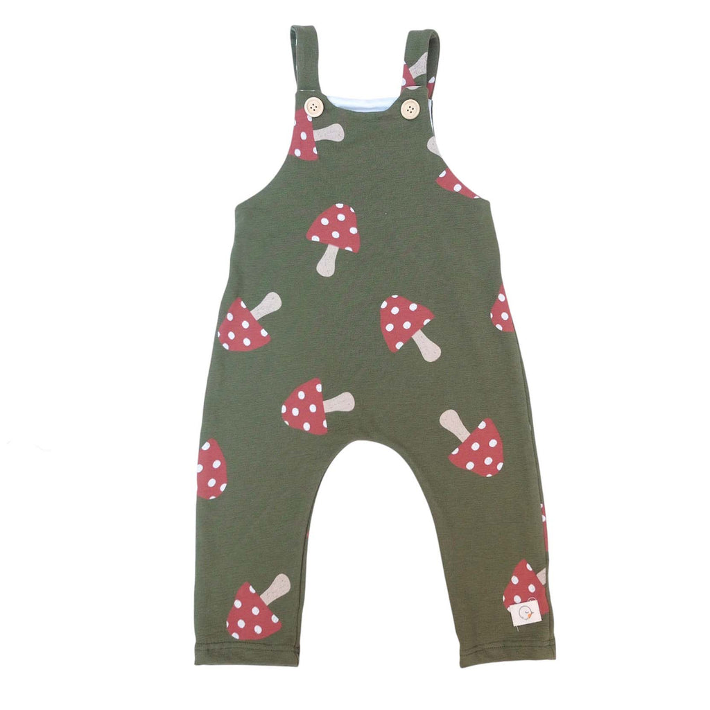 Peto de algodón orgánico con estampado de setas en fondo verde.